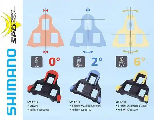 Bloki pedałów Shimano SPD SL SM-SH12, niebieskie, 2 stopnie luzu Jest to element, który przykręcamy do buta szosowego w systemie SPD SL i razem z nim wpinamy się nim do pedała Shimano SPD SL.Bloki posiadają funkcjonalność jednokierunkowego wypinania się z pedałów (ruchem pięty w bok).Bloki oznaczone kolorem niebieskim posiadają dwustopniowy luz na pedale aby w trakcie jazdy nadmiernie nie męczyły się stawy skokowe ani kolanowe.W komplecie znajdują się śrubki montażowe oraz podkładki. W komplecie nie ma blaszkek, które umieszcza się wewnątrz butów i przykręca do nich bloki. Najważniejsze cechy produktu: Producent: ShimanoModel: SM-SH12Przystosowane do butów: szosowych na 3 śrubyKompatybilne z pedałami Shimano: PD5700, PD5800, PD6700, PD6800, PD9000, PDR540, PDR550, PD-9000, PD-6700-C Luz na bloku: 2oKolor: czarno-niebieskiŚrednia waga:~ 35 g (bloki) + 35 g (śruby i podkładki) Zastosowane technologie Shimano: SHIMANO PEDALING DYNAMICS SL(SPD SL)Zawodowcy dla CIEBIEZrodzona z wymagań serii Pro Tour dotyczących optymalnej siły i wytrzymałości technologia pedałów niskoprofilowych rozpowszechniła się rónież wśród wielu innych rowerzystów, łącznie z zawodnikami wszystkich poziomów, sportowcami, kolarzami renującymi i rekreacyjnymi. SPD-SL to szosowa platforma pedałów systematycznie udoskonalana wraz z obuwiem SHIMANO w celu przenoszenia większej siły z ciała na rower. Dzięki SPD-SL energia pedałowania jest rozpraszana na szerszej powierzchni i skuteczniej przenoszona na korbę, nawet przy ekstremalnych obciążeniach. Żadnych zmarnowanych ruchów. Żadnych strat spowodowanych odstępami, odkształceniami i niedopasowanymi elementami. SPD-SL pomaga wygrywać i osiągać cele. Ta sama skuteczność, która prowadzi zawodowców na podium, jest dostępna dla każdego rowerzysty. Zwiększona trwałość na dłuższe trasy. Większy komfort i lepsza zabawa! Opracowane dla spełnienia oczekiwań rowerzysty. Dopasowane do rowerzysty. Twój wybór. Wydajność przenoszenia siłySPD-SL jest to udoskonalona wersja szosowa systemu SPD. Ta platforma pedałów została specjalnie opracowana dla potrzeb światowej klasy kolarzy szosowych. Jednolity pedał i interfejs bloków pozwalają na lepsze przenoszenie siły na pedał, pracujący pod ogromnymi obciążeniami związanymi z pedałowaniem podczas zawodów i nie tylko.