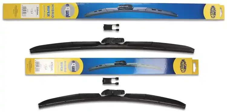 Nowe wycieraczki; zapakowane w oryginalne opakowanie producenta. Cena zakupu dotyczy 1kompletu (strona kierowcy i pasażera).  Wycieraczki hybrydowe Magneti Marelli to wyjątkowa konstrukcja i najwyższa jakość materiałów:- Guma – ponad 50% kauczuku naturalnego z grafitową powłoką; wewnątrz gumy podwójna stal nierdzewna.- Złącze – materiał POM (tworzywo termoplastyczne o wysokiej wytrzymałości mechanicznej i odporne na ciepło)- Spojler – materiał ABSWycieraczki montuje się bardzo szybko i sprawnie; obrazkowa instrukcja montażu znajduje się na ich opakowaniu.Zalety wycieraczek hybrydowych Magneti Marelli1.Jeden uniwersalny adapter w wycieraczkach hybrydowych Magneti Marelli znajduje zastosowanie w czterech różnych ramionach wycieraczek, co sprawia, że pasują do większości modeli samochodów.2. Sztywne gumowe pióro z grafitową powłoką w wycieraczce hybrydowej Magneti Marelli zapewnia bardziej skuteczne wycieranie powierzchni szyby.3. Wycieraczki hybrydowe Magneti Marelli dzięki zaawansowanej technologii, mogą zastąpić dotychczasowe tradycyjne wycieraczki w starszych modelach samochodów, a ich wymiana jest szybka i łatwa.4. Wycieraczki hybrydowe Magneti Marelli są odporne na niekorzystne warunki atmosferyczne ; zakres temperatury, w których ich praca odbywa się bez zakłóceń to -25ºC do +50ºC.5. Jakość materiałów użytych do produkcji wycieraczek hybrydowych Magneti Marelli zapewnia ich wytrzymałość oraz cichą pracę.6. Nowoczesny design zastosowany w wycieraczkach hybrydowych Magneti Marelli sprawia, że to jedne z bardziej poszukiwanych wycieraczek na świecie.  Jak dbać o wycieraczki:- pamiętaj, aby dbać o gumę wycieraczki usuwając z niej brud, owady itp., które osiadły podczas jej pracy (wykorzystać można do tego łagodny detergent); zapominanie o usuwaniu zanieczyszczeń, może doprowadzić do uszkodzenia gumy wycieraczki- nigdy nie używaj wycieraczek, gdy szyba jest sucha;  tarcie gumy po suchej szybie może doprowadzić do szybkiego jej zużycia- jeżeli wycieraczka na szybie podskakuje, może to być oznaką, że ramię wycieraczki jest skrzywione; w takim przypadku należy dokonać jego regulacji- jeżeli planujesz pozostawienie samochodu  na słońcu przez kilka dni, ustaw wycieraczki tak, aby nie stykały się z szybą- po wizycie na myjni, pamiętaj, aby zawsze dokładnie oczyścić szybę, ponieważ znajdujący się na niej wosk, może powodować przeskakiwanie wycieraczki- pamiętaj również, aby nie uruchamiać wycieraczek na zamarzniętej szybie; może to bowiem doprowadzić do ich uszkodzenia lub oderwania gumy od mocowania.