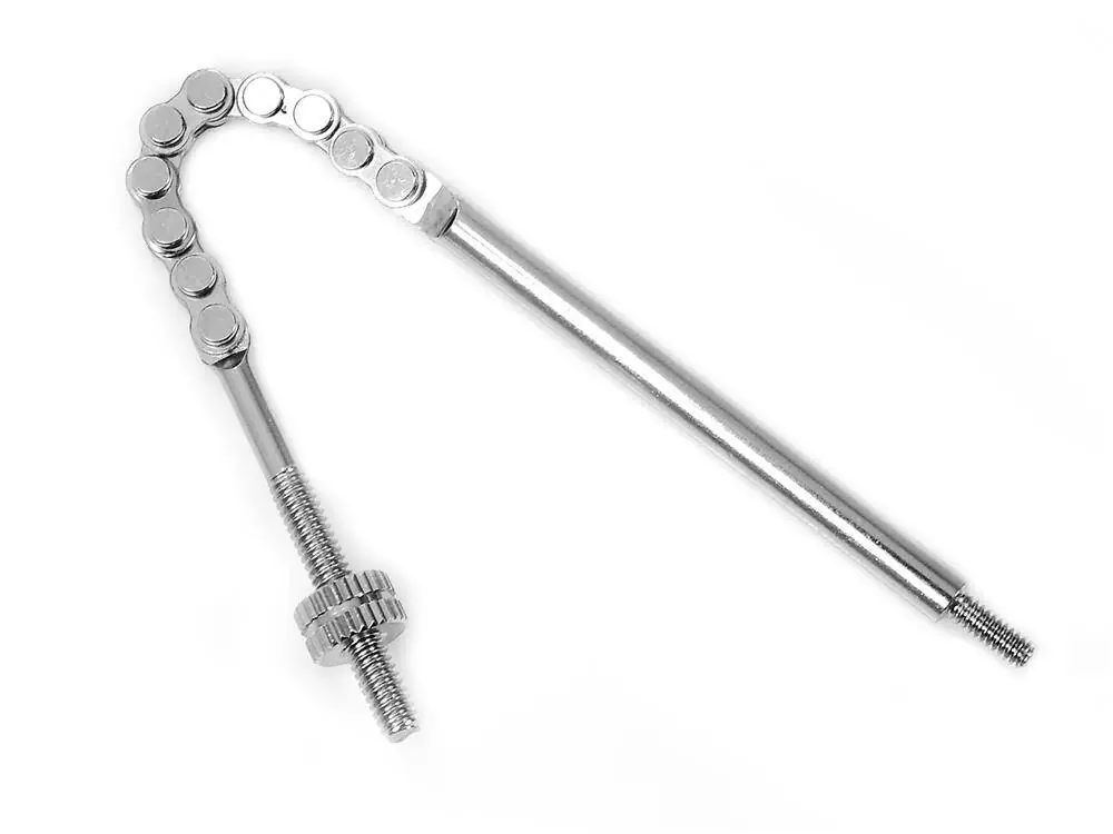 Łańcuszek tylnej piasty wielobiegowej z nakrętką kontrującą. Cechy produktu Długość całkowita: 127 mmDługość łańcuszka: 43 mmDługość całkowita trzpienia wchodzącego w piastę: 53 mmDługość gwintu M2 od strony piasty: 6 mmDługość trzpienia od strony linki: 31 mmDługość gwintu M3 od strony linki: 21 mmwaga:~ 11 gPosiada nakrętkę kontrującą.
