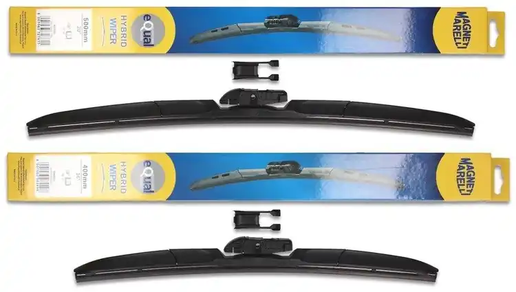 Nowe wycieraczki; zapakowane w oryginalne opakowanie producenta. Cena zakupu dotyczy 1kompletu (strona kierowcy i pasażera).  Wycieraczki hybrydowe Magneti Marelli to wyjątkowa konstrukcja i najwyższa jakość materiałów:- Guma – ponad 50% kauczuku naturalnego z grafitową powłoką; wewnątrz gumy podwójna stal nierdzewna.- Złącze – materiał POM (tworzywo termoplastyczne o wysokiej wytrzymałości mechanicznej i odporne na ciepło)- Spojler – materiał ABSWycieraczki montuje się bardzo szybko i sprawnie; obrazkowa instrukcja montażu znajduje się na ich opakowaniu.Zalety wycieraczek hybrydowych Magneti Marelli1.Jeden uniwersalny adapter w wycieraczkach hybrydowych Magneti Marelli znajduje zastosowanie w czterech różnych ramionach wycieraczek, co sprawia, że pasują do większości modeli samochodów.2. Sztywne gumowe pióro z grafitową powłoką w wycieraczce hybrydowej Magneti Marelli zapewnia bardziej skuteczne wycieranie powierzchni szyby.3. Wycieraczki hybrydowe Magneti Marelli dzięki zaawansowanej technologii, mogą zastąpić dotychczasowe tradycyjne wycieraczki w starszych modelach samochodów, a ich wymiana jest szybka i łatwa.4. Wycieraczki hybrydowe Magneti Marelli są odporne na niekorzystne warunki atmosferyczne ; zakres temperatury, w których ich praca odbywa się bez zakłóceń to -25ºC do +50ºC.5. Jakość materiałów użytych do produkcji wycieraczek hybrydowych Magneti Marelli zapewnia ich wytrzymałość oraz cichą pracę.6. Nowoczesny design zastosowany w wycieraczkach hybrydowych Magneti Marelli sprawia, że to jedne z bardziej poszukiwanych wycieraczek na świecie.  Jak dbać o wycieraczki:- pamiętaj, aby dbać o gumę wycieraczki usuwając z niej brud, owady itp., które osiadły podczas jej pracy (wykorzystać można do tego łagodny detergent); zapominanie o usuwaniu zanieczyszczeń, może doprowadzić do uszkodzenia gumy wycieraczki- nigdy nie używaj wycieraczek, gdy szyba jest sucha;  tarcie gumy po suchej szybie może doprowadzić do szybkiego jej zużycia- jeżeli wycieraczka na szybie podskakuje, może to być oznaką, że ramię wycieraczki jest skrzywione; w takim przypadku należy dokonać jego regulacji- jeżeli planujesz pozostawienie samochodu  na słońcu przez kilka dni, ustaw wycieraczki tak, aby nie stykały się z szybą- po wizycie na myjni, pamiętaj, aby zawsze dokładnie oczyścić szybę, ponieważ znajdujący się na niej wosk, może powodować przeskakiwanie wycieraczki- pamiętaj również, aby nie uruchamiać wycieraczek na zamarzniętej szybie; może to bowiem doprowadzić do ich uszkodzenia lub oderwania gumy od mocowania.